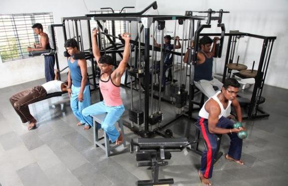 Gymnasia have a main workout area, which primarily consists of free weights including dumbbells, barbells, rowing machines, stationary exercise bikes, elliptical trainers and exercise machines. This area often includes mirrors so that exercisers can monitor and maintain correct posture during their workout. Exercise that is conducted by qualified fitness instructors .
